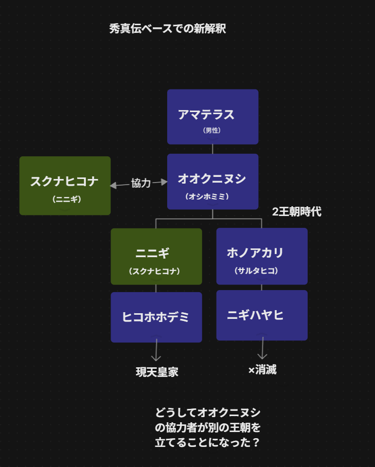仮にこの等式を認めると、秀真伝に記された瓊瓊杵尊と火明命の二人の王が立ったとされる二王朝時代がどのようなものであったのかが見えてくるのと同時に、瓊瓊杵尊の天孫降臨の記述が実際にどのような意味を持つのかも分って来るのです。